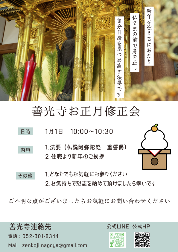 また、来月1月1日 午前10時より、 善光寺にて修正会(しゅしょうえ)を執り行います。